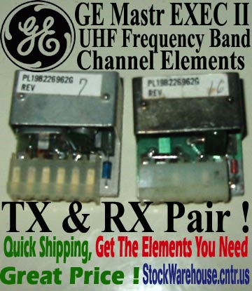 StockWarehouse.cntr.us GE, General Electric Mastr Series Channel Elements or Icoms. For Radios, GE Mastr Series Portables Or Handhelds, PE or PY, GE Mastr Exec II & The Highly Popular GE Mastr II Most communications dealers selling these elements will charge a high price per element. We offer our elements as a Transmit & Receive Crystal Element Or Icom Pair for one low price often at what most sell an individual element for. We have an assortment of GE Channel Elements from an acquired GE Master Radio Service shop inventory and these elements were removed from working radios that were removed from service and we have them available in RX TX Pairs As shown below and priced to move quick to get them out of here. Please no custom frequency request, we can only fulfill orders for the band and type as explained below! Most of these are from surplus radios so we do not guarantee or provide any particular frequency with the assumption that you are going to re-crystal these anyway for your own purposes. All we can assure you is that we will send you a Receive and Transmit crystal element or icom usable for the band in which you specify from the choices below with the understanding that you are going to re-crystal these yourself if they even happen to already have a crystal even still in them. It will be whatever it is with absolutely no preference on our part to the exact frequency of the crystal. We simply match radio icom type from the choices below and the overall band only as shown from choices below with your request and we send what have handy. You simply send us a request for a TX & RX (Transmit and Receive) Icom or Element Pair and we ship them out fast and cheap! Nothing fancy or complicated, just a low priced channel element or icom with no attention or preference to exact frequency other than the correct band we are shipping for on the icom as called by GE deal ready and available for you. We have the following inventories of these elements. Most Radio Dealers sell these for expensive prices per element or icom. We sell them priced per band matched pair at often lower prices than most communication seller will offer these at.